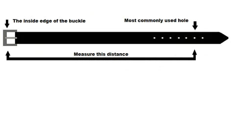 Using a fabric or tailors tape measure, measure from the inside edge of your buckle (where the tongue of the buckle meets the end) to your most often used belt hole and round up or down to the nearest full inch.