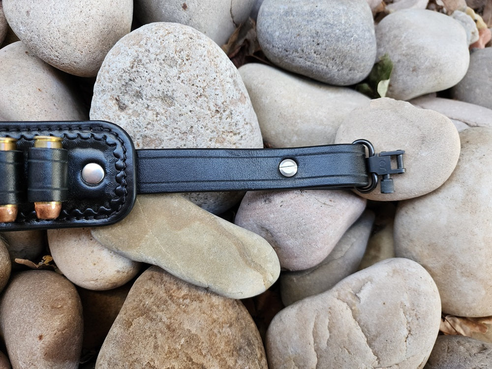 Handcrafted leather rifle sling with a sturdy simplicity to make your carry easy. In full grain veg tan 10oz saddle skirt leather this straight sling and ammo slide shoulder pad provides 16 rounds of additional ammunition.  Sling comes with American manufactured Grovtec 1" wide swivel mounting hardware.